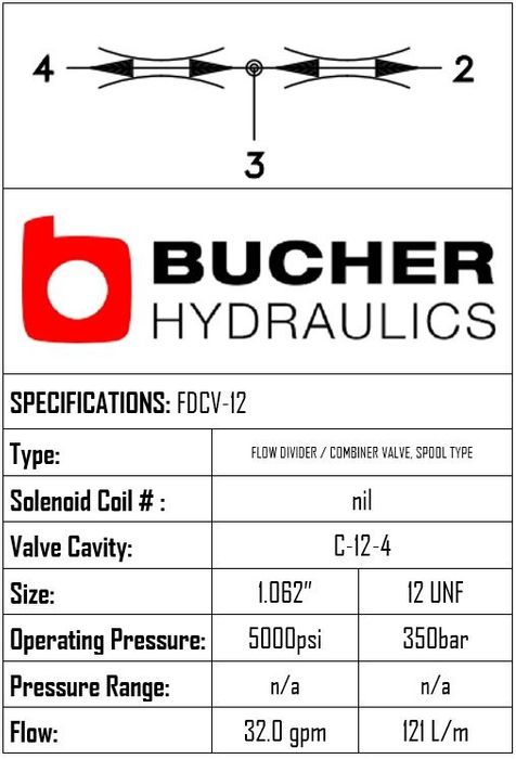 FDCV-12-N-0-66 • FLOW DIVIDER/COMBINER VALVE • SPOOL TYPE • 50:50 RATIO • C-12-4 • 350 BAR • 121 LPM • BUCHER