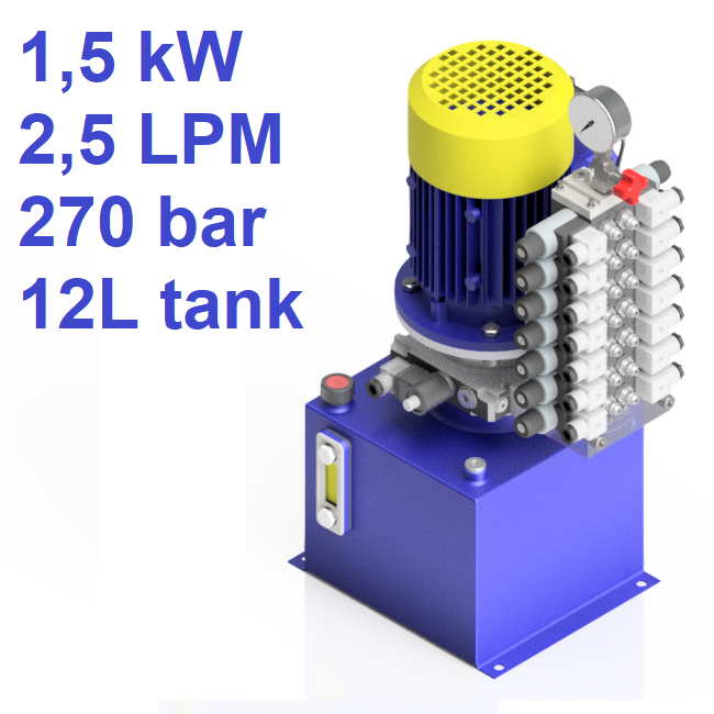 HPU-AC-1,5-1PH-12 • 240 V AC • MOTOR 1.5 KW • PRESSURE 270 BAR • FLOW 2.5 L/MIN • TANK 12 L • PMC 30 • PRIMEHYD