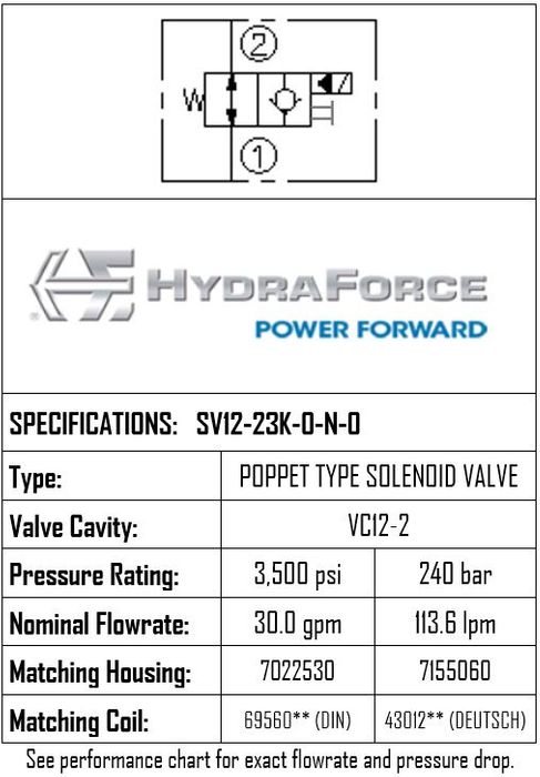 SV12-23K-0-N-0 • SOLENOID VALVE 2-WAY NORMALLY OPEN POPPET TYPE • C-12-2 • 240 BAR • 114 LPM • HYDRAFORCE