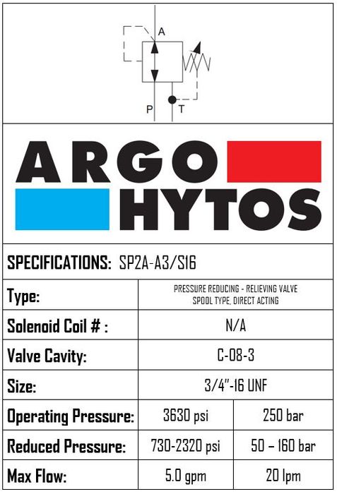 SP2A-A3/S16 • PRESSURE REDUCING/RELIEVING VALVE DIRECT ACTING SPOOL • C-8-3 • 350 BAR (50–160 BAR) • 20 LPM • ARGO HYTOS