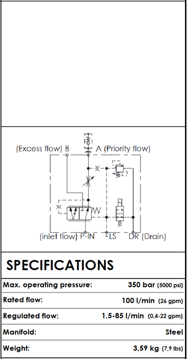 MF000054 • INLINE PRIORITY FLOW CONTROL VALVE • PRESSURE-COMPENSATED • 1/2" BSPP X 3 AND 1/4" BSPP X 2 • 350 BAR • 100 LPM (1.5–85 LPM) • ATLANTIC FLUID TECH