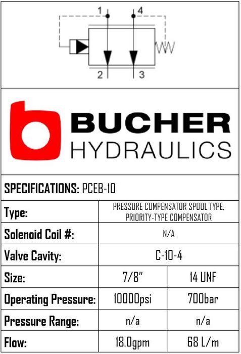 PRESSURE COMPENSATOR VALVE, DIRECT ACTING, CAVITY SIZE C1020, PORT SIZE CARTRIDGE ONLY, OPERATING PRESSURE 350 BAR, FLOW CAPACITY 30 L/MIN (7.9 GPM), COIL NONE, BRAND BUCHER HYDRAULICS