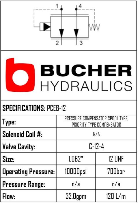 PRESSURE COMPENSATOR VALVE, DIRECT ACTING, CAVITY SIZE C1212, PORT SIZE CARTRIDGE ONLY, OPERATING PRESSURE 350 BAR, FLOW CAPACITY 40 L/MIN (10.6 GPM), COIL NONE, BRAND BUCHER HYDRAULICS