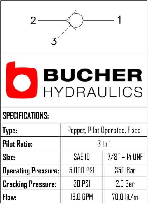 POCI-10-N-F-0-30 • CHECK VALVE, PILOT OPERATED, POPPET TYPE, PILOT TO OPEN • 2 BAR • C-10-25 • 350 BAR • 70 LPM • BUCHER