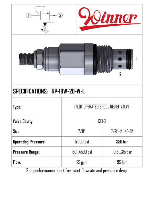 RELIEF VALVE PILOT OPERATED BALANCED PISTON, CAVITY 10W-2, CARTRIDGE ONLY, 7 TO 420 BAR, 95 L/MIN (25 GPM), WINNER