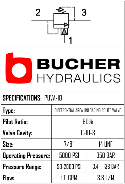 PUVA-10-N-S-08-40 • UNLOADING VALVE DIFFERENTIAL AREA DIRECT ACTING • C-10-3 • 350 BAR • 3.80 LPM • BUCHER HYDRAULICS