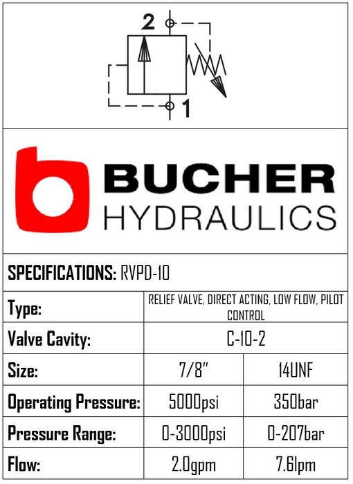RVPD-10-N-S-0-30 • RELIEF VALVE • DIRECT ACTING • LOW FLOW • PILOT CONTROL • C-10-2 • 350 BAR (SET 50–210 BAR) • 7.6 L/MIN • BUCHER