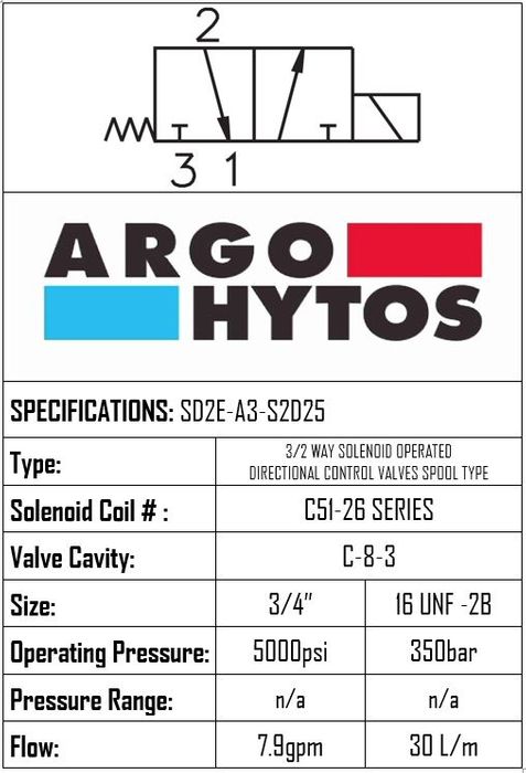 SD2E-A3/S2D25N • SOLENOID VALVE 3-WAY 2-POSITION DIRECTIONAL • C-8-3 • 350 BAR • 30 LPM • ARGO