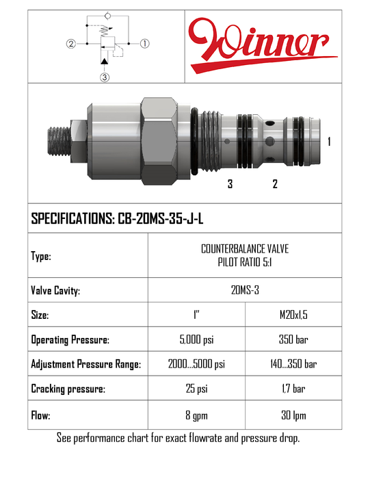 CB20MS35JL • COUNTERBALANCE VALVE LOAD HOLDING 5:1 PILOT • 20MS-3 • 350 BAR (SET 140-350 BAR) • 30 LPM • WINNER